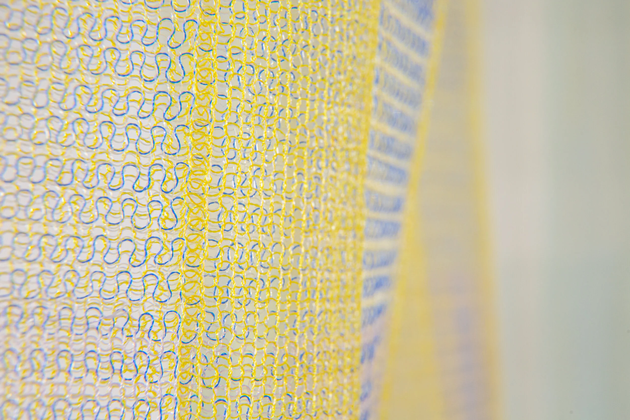 This installation is made up of five 35” panels. Each panel is knitted on the Stoll machine separately, then connected through invisible seaming by hand.