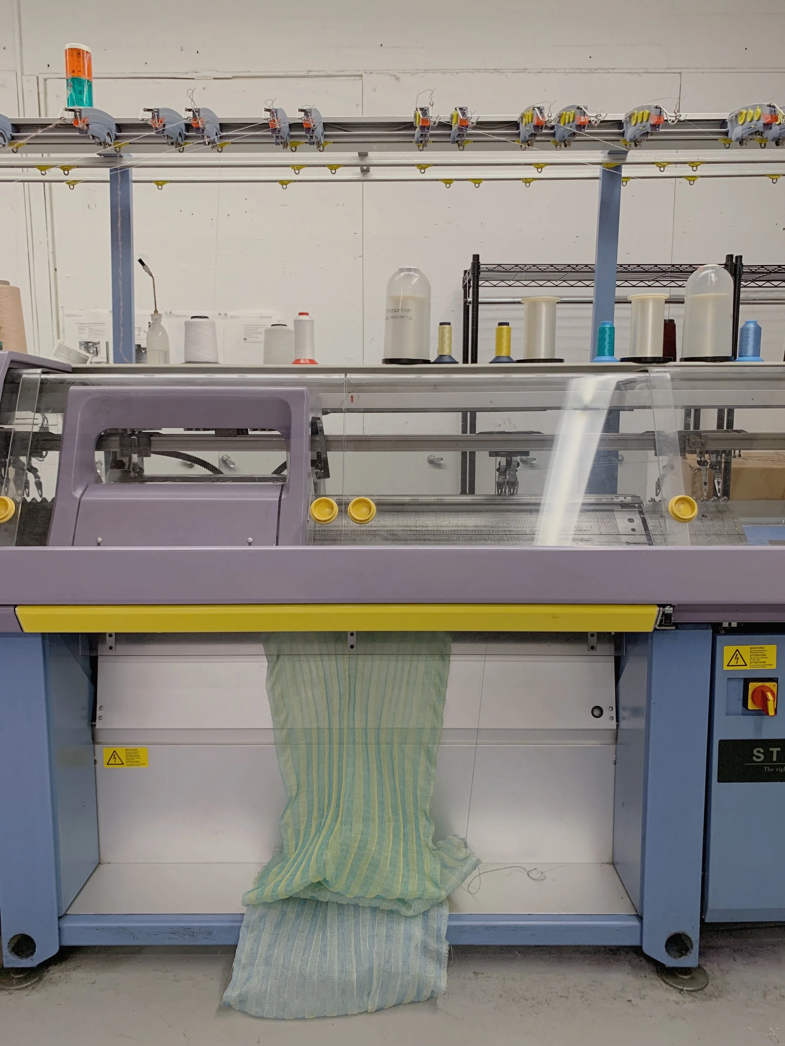 Because knitting has so many unpredictable variants, sampling is the only way to understand the behavior of the specific yarn at a certain tension, structure, material combination, repeat size and scale, and even yarn-positioning on the machine.