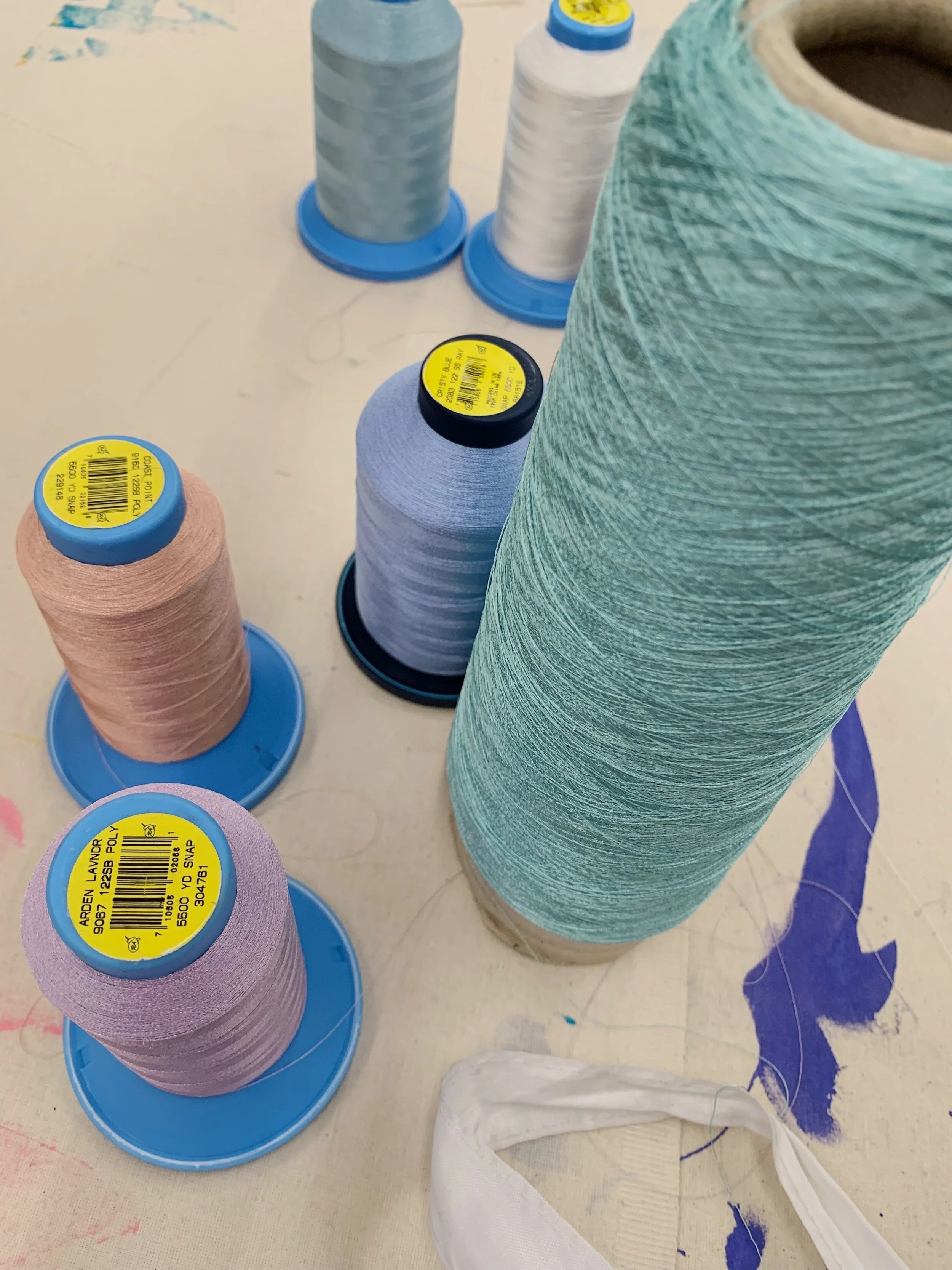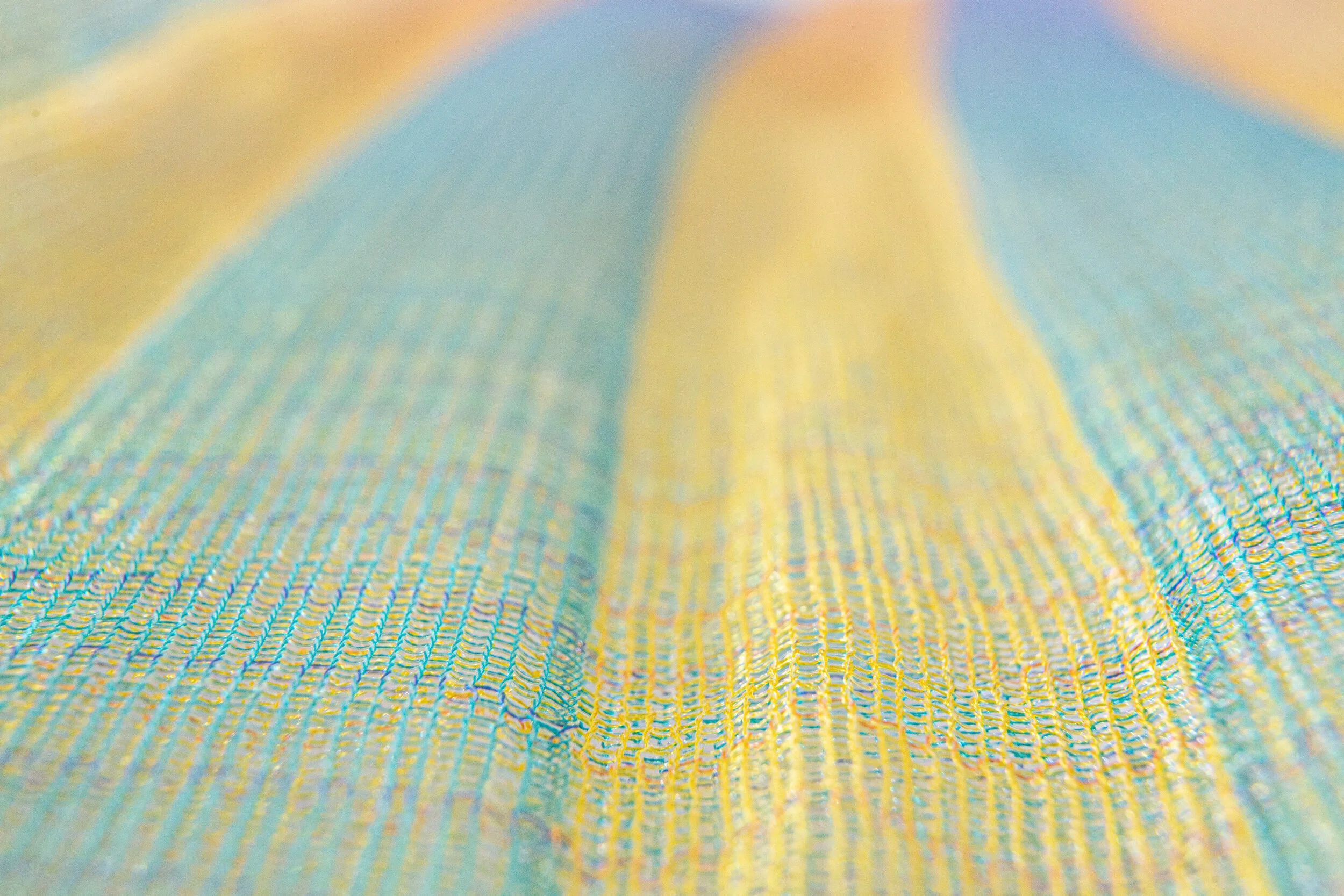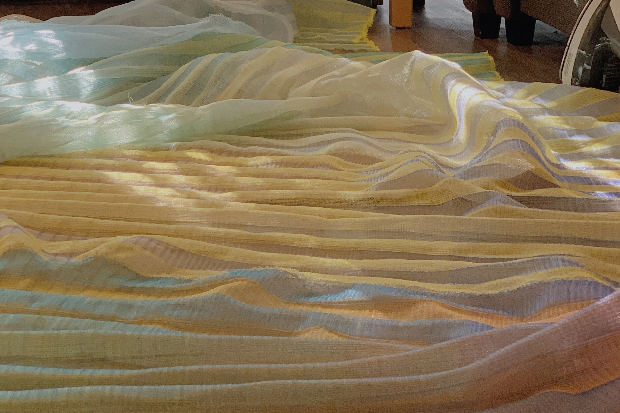As rayon has a natural softness and sheen to it, color gradient was achieved through using hues of blues, greens, reds, and yellows in rayon yarns.