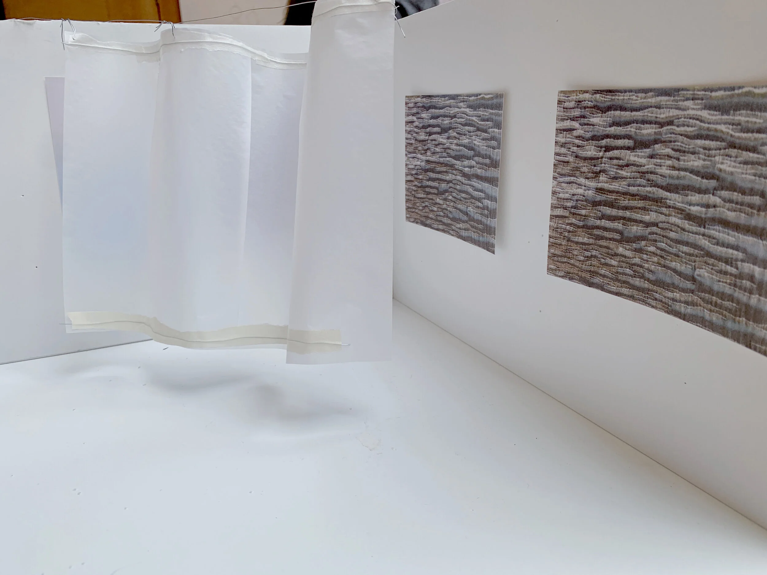 This mock-up sample uses semi-transparent vellum paper and fine wire to mimic the curvature of the entirety of the installation.